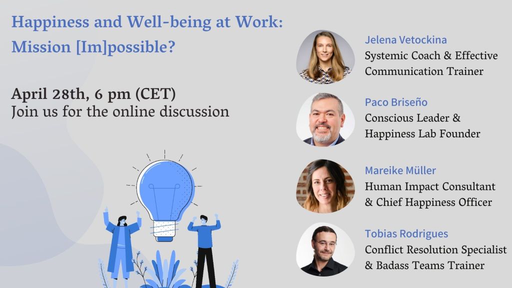 This week I had an honor to lead the online discussion with several human impact leaders and conflict resolution experts, during which we shared our ideas and practices on personal happiness and well-being at work.